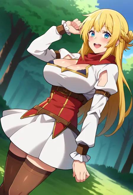 • rittolbase, large breasts, blonde hair, white dress, long hair, hair bun, french braid, red scarf, cleavage, juliet sleeves, long sleeves, red underbust, belt, brown thighhighs, boots,
