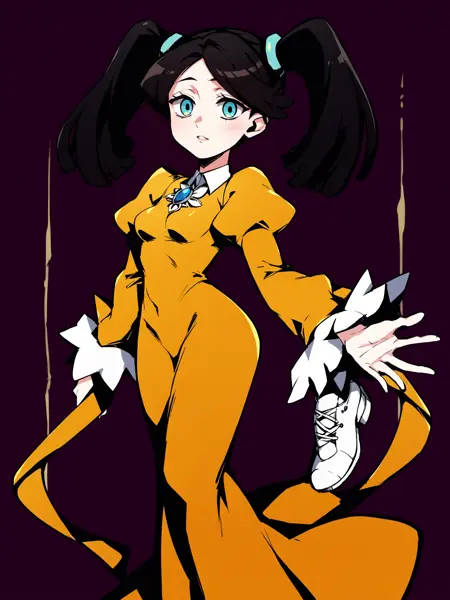 シエナ・コステロ: シエナ、1人女子、単独、胸、長袖、靴、ふわふわの袖、青い目、ジュリエット袖、ロングドレス、黄色のドレス、黒髪