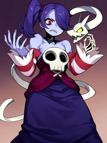 役立つプロンプト: 肩を露出、袖が離れている、片方の目に髪が垂れている、赤い目、サイドポニーテール、襟が離れている、頭蓋骨、青い肌、縫い目、ゾンビ、ストライプの袖、口が縫い付けられている。