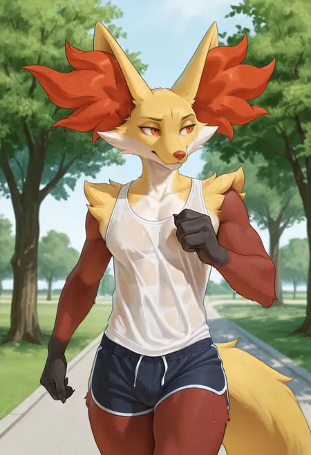 注意: 在生成Delphox的男性版本时,由于训练数据以女性为主,即使使用了男性标签,模型仍会生成女性形象。可通过添加“pecs”来修正。
