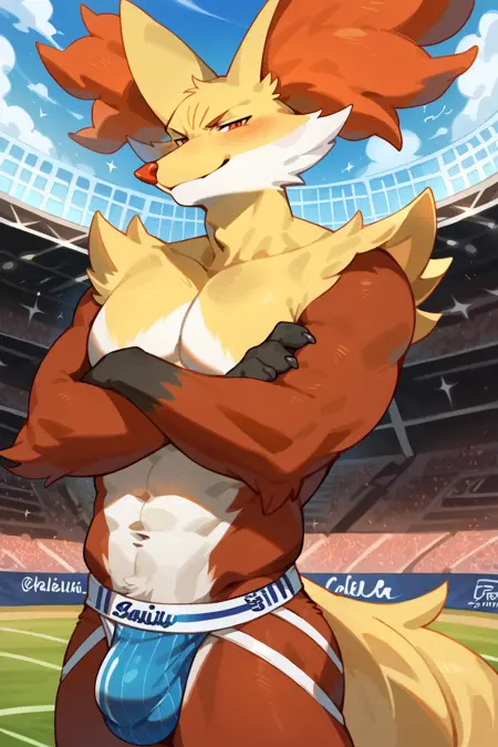 Note: When generating male versions of Delphox, because the training data is heavily female dominated, it generated female despite having the male tag. Adding "pecs" to fix it.