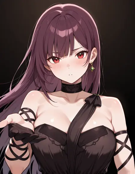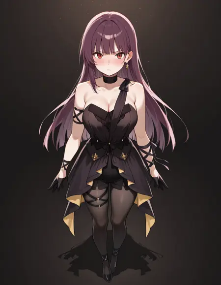 Makiattodrs, sleeveless, BI_strapless_dress, BI_single_strap, BI_ankle_strap, BI_thigh_straps, BI_arm_ribbon, red arm ribbon, black arm ribbon, BI_half_gloves, BI_choker, BI_pantyhose, BI_earrings, BI_high_heels