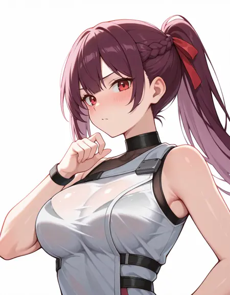 Makiatto, red eyes, long hair, purple hair, single hair bun, braid