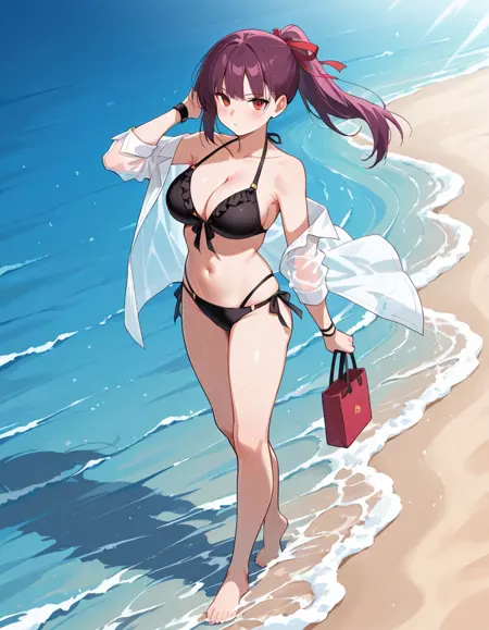 WASummer, 옷 아래 패션 수영복, MR_one-piece_swimsuit, 검은 수영복, 흰 재킷, MR_choker, MR_hair_ribbon, MR_see-through-jacket, MR_thigh_strap