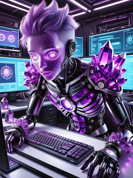 무엇이든 아마스트로 변환하세요! "반짝이는 아마스트 결정으로 만들어진"을 사용하여 결과를 얻으세요(예시 이미지의 프롬프트 참조).