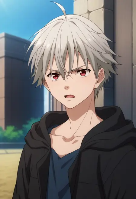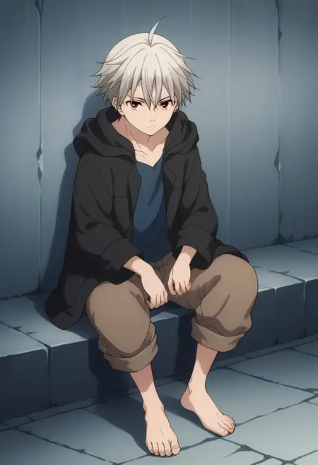 yoshio, 1boy, male focus, barefoot, red eyes, hood, hoodie, ahoge, grey hair, black hoodie, brown pants, shirt, blue shirt, open hoodie, open clothes