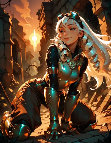 armor, baggy pants, greaves, goggles on head, gauntlets,