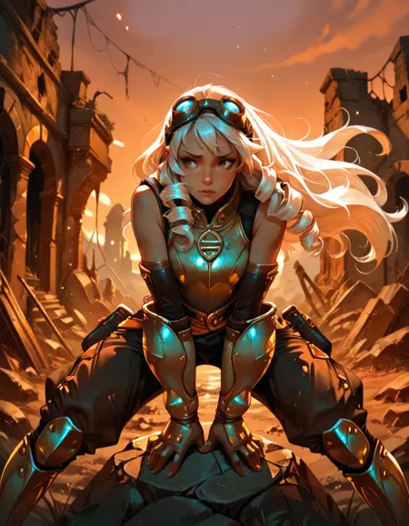armor, baggy pants, greaves, goggles on head, gauntlets,