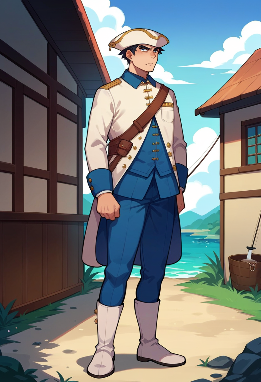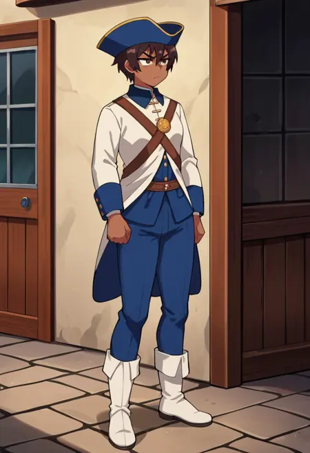 18〜19世紀の軍服で非常に人気のあった色遣いは青いジャケットと白いズボンだったが、1750年頃のスペイン軍服の一部は後者を採用しており、ここではそれを再現している。メインプロンプトは「Iberianuni」で、それに「military uniform,blue pants,white jacket」や「hat」「bicorne」などが含まれる。