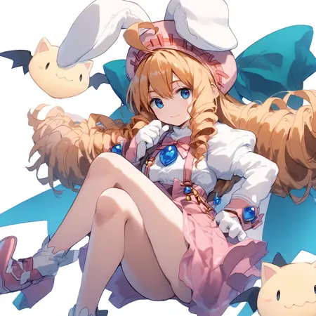fancy_mel(dewprism), long hair, skirt, brown hair, gloves, dress, hat, bow, short sleeves, puffy sleeves, orange hair, black eyes, drill hair, suspenders, pink dress, pink skirt, suspender skirt, pink headwear, ringlets