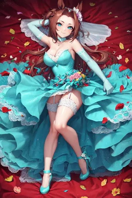 - 官方替换服装,发饰,花饰,头冠,婚纱面纱,荷叶边项圈,蓝色项圈,珍珠项链,饰品,锁骨,婚纱,无肩带礼服,水蓝色礼服,裸露肩部,胸部曲线,长手套,腕带,白色手套,婚纱绑带,水蓝色鞋履,高跟鞋