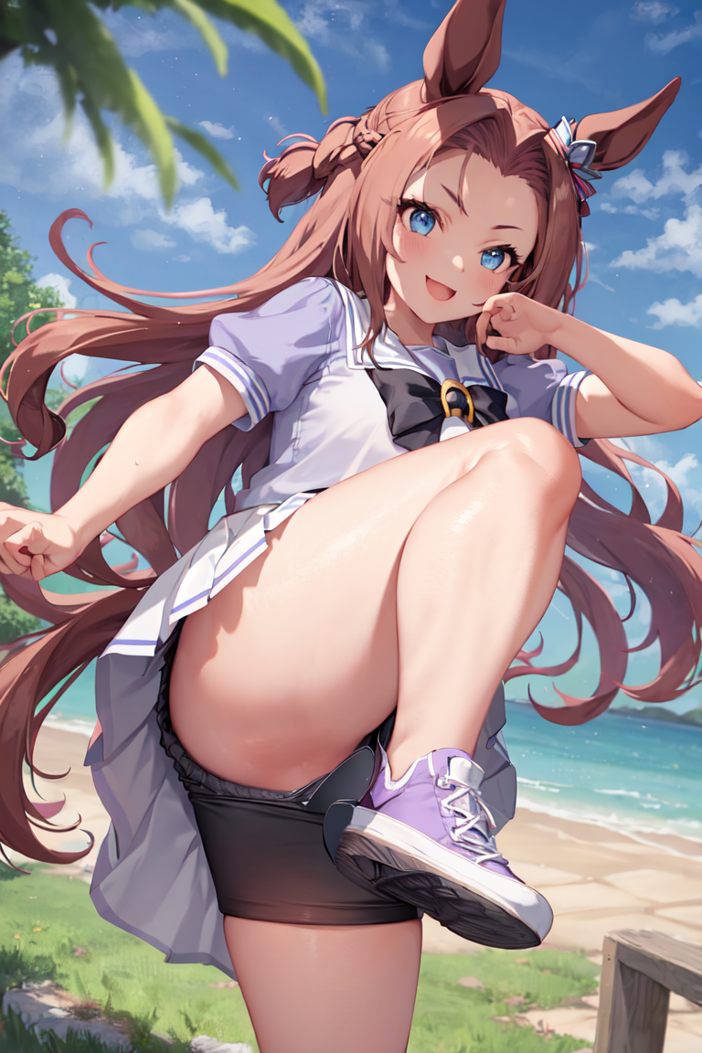 - Tracen 校服,夏季制服,水手服,蓬松短袖,紫色领结,马蹄形饰品,水手领,水手衬衫,紫色衬衫,白色裙子,百褶裙,荷叶边裙,迷你裙,绝对领域,白色过膝袜,棕色鞋子,乐福鞋