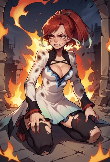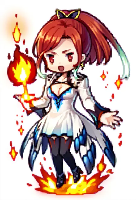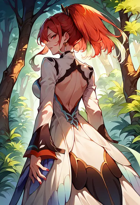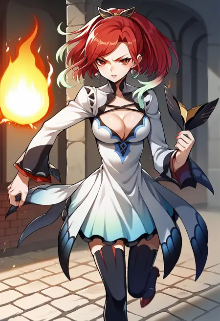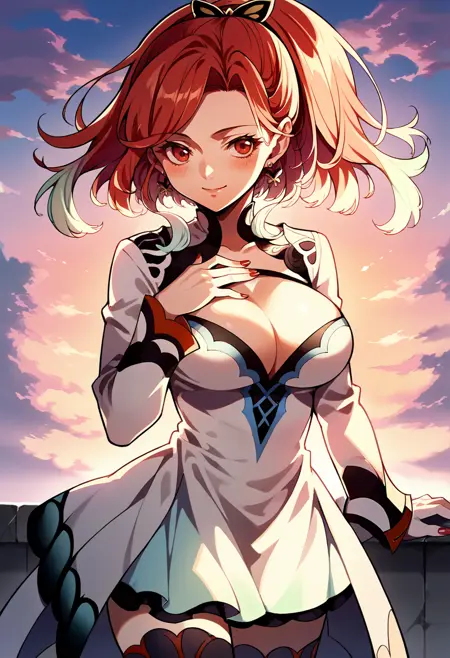 Default appearance: seresToB, gradient hair, sidelocks, ponytail, hair ornament, earrings, white dress, cleavage cutout, long sleeves, red nails, black thighhighs