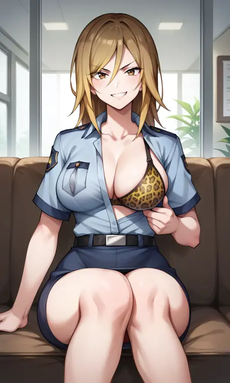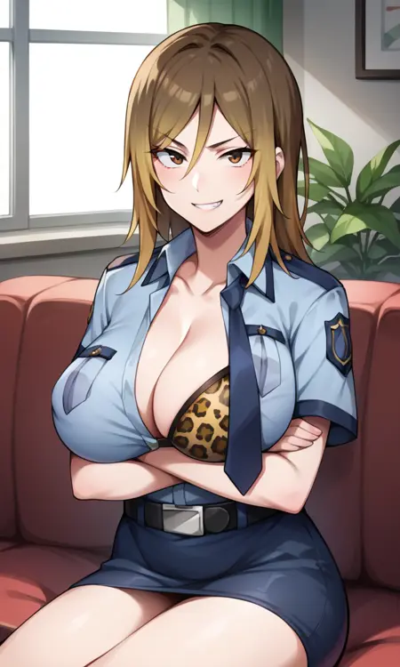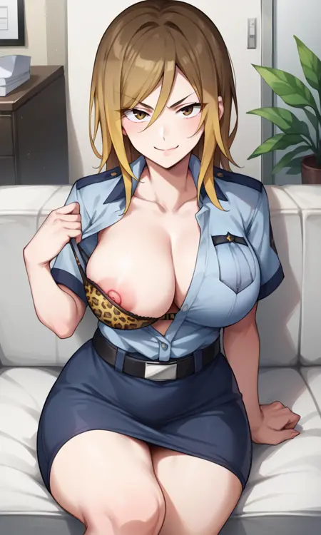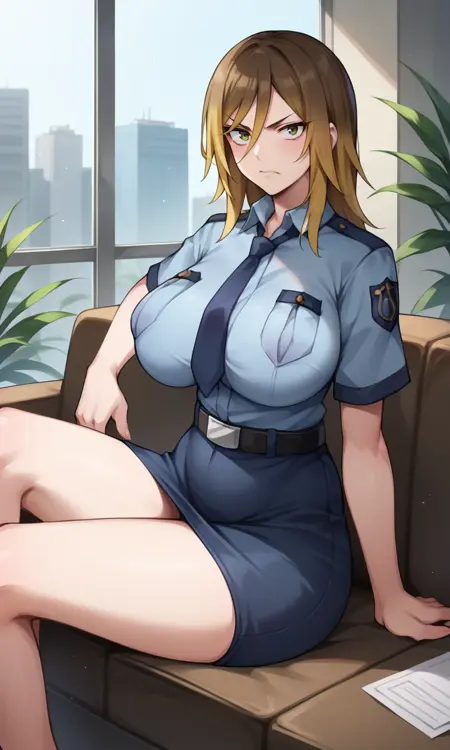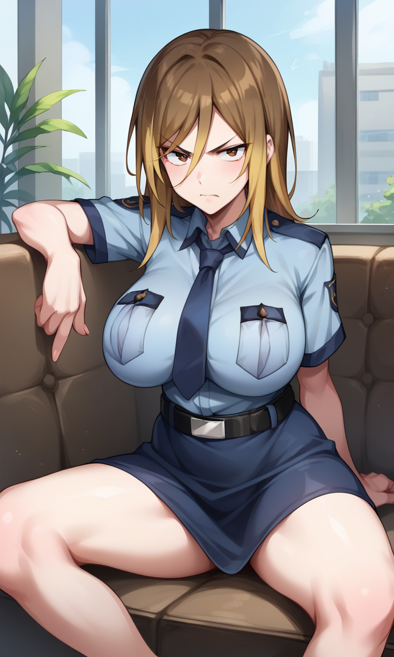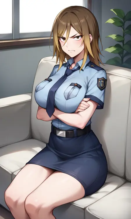 Date Makiko, policewoman, police uniform, blue necktie, blue shirt, breast pocket, short sleeves, blue miniskirt, tsurime, brown eyes, brown hair, two-tone hair, belt, bare legs, v-shaped eyebrows, black shoes