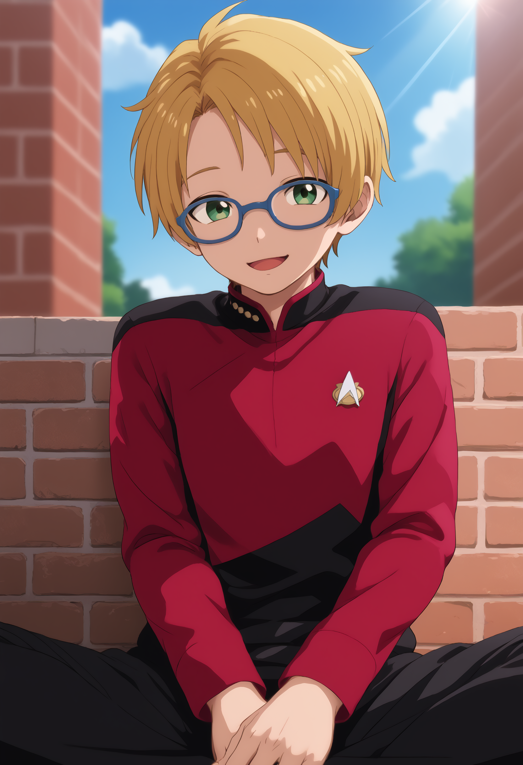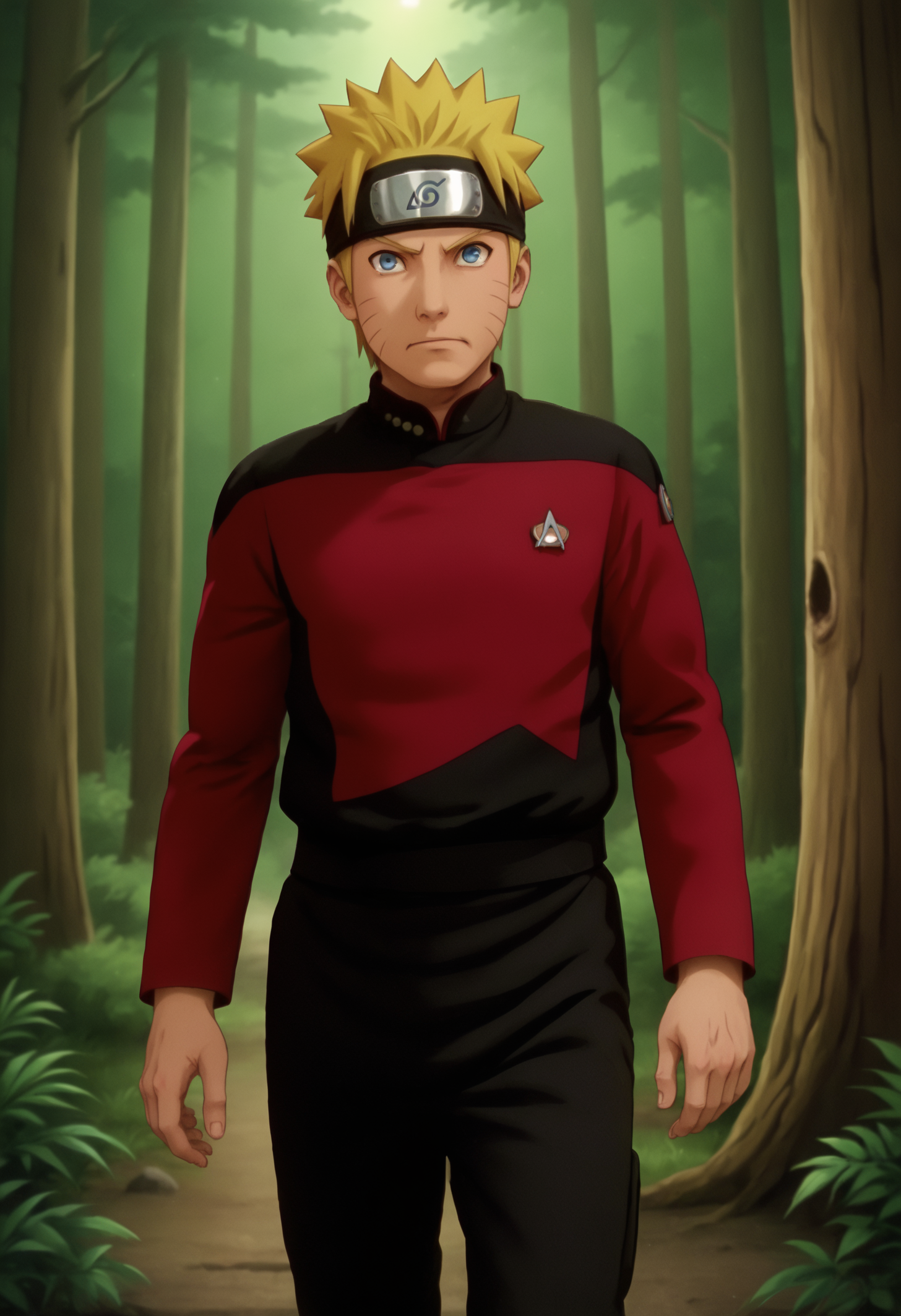 uniform,black shoulders,black pants",其中颜色为红色、黄色或蓝色。 在负面提示中添加 "collar,high collar" 以获得无领版本,因为部分模型会自动添加衣领。