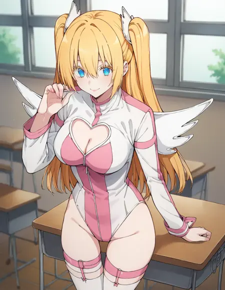 리엘 훈련, 레오타드, 가슴 노출 컷아웃, 가슴, 긴 소매, 날개, 허벅지 스트랩, 흰 허벅지 양말, 검은 굽