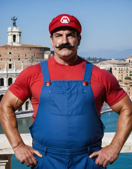 触发词:马里奥、红衬衫、蓝色背带裤、红帽子、胡子、有男子气概、肌肉发达、胖男人(可选)