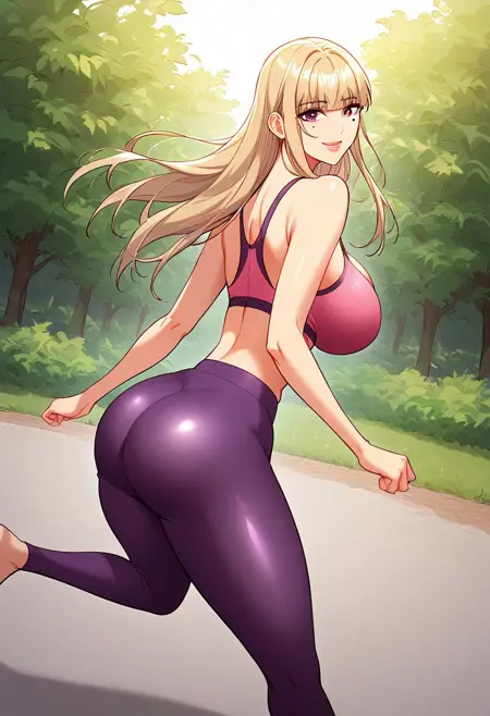 13. ((セクシーな短袖のグレーのトップ、過剰な胸元、巨大な胸元、お腹の部分が露出、セクシーな濃い青のヨガパンツ、)) 白いスポーツシューズ、