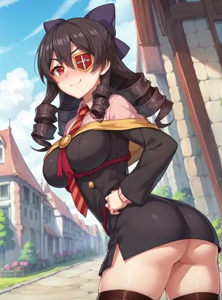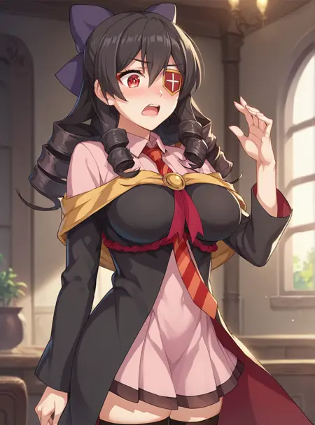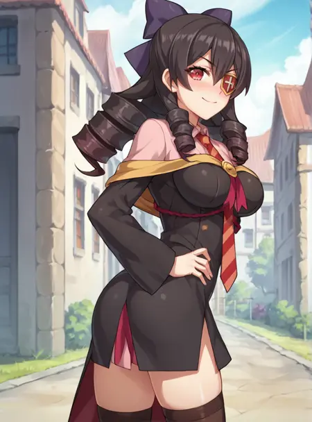 Prompts:1girl, solo, eyepatch, red eyes, breasts, necktie, large breasts, long hair, bow, black hair, drill hair, thighhighs,