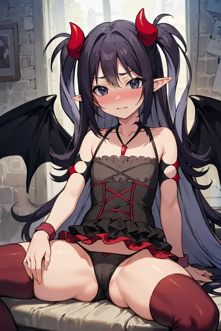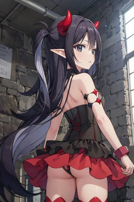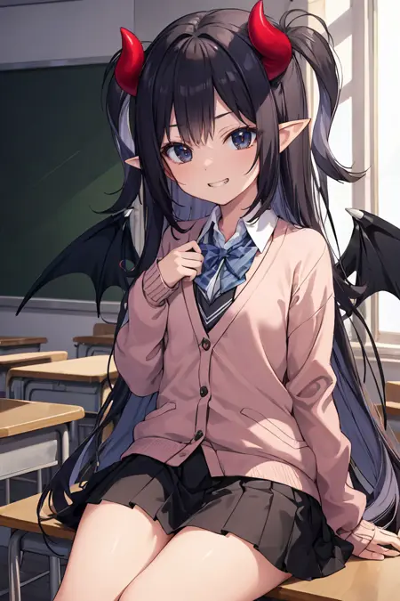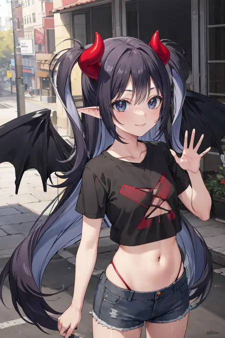 外見:ucelia、非常に長い髪、平らな胸、黒い目、両側を上げたスタイル、とがった耳、悪魔の角、悪魔の翼(尾は追加しないでください。警告しました)
