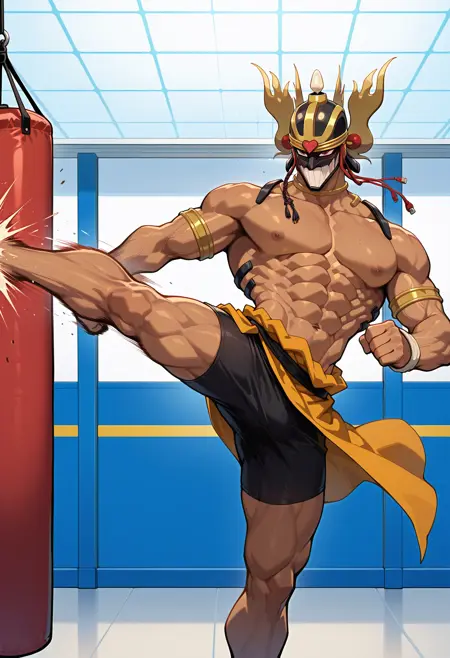 Can be prompted with or withouth tattoos, a spear/staff, a buddhist wheel, and a set of keys (that almost never works, better fix that in the dataset). Supports some kicks out of the box too.