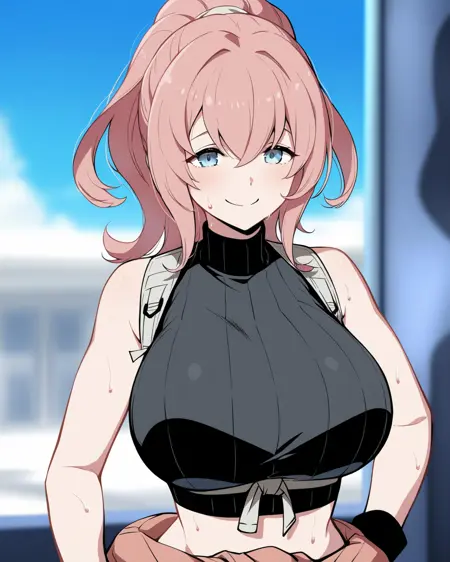 ,maria, 1girl, シングル, ピンクの髪, 青い目, ポニーテール, 長い髪, 前髪, 目の間に髪, クロップトップ, 袖なし, 腰周りに服, オレンジのパンツ,