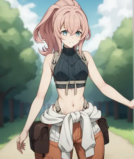 ,마리아, 1소녀, 솔로, 분홍색 머리, 파란 눈, 풀터일, 긴 머리, 앞머리, 눈 사이의 머리, 크롭탑, 소매 없음, 허리 주변의 옷, 주황색 바지,