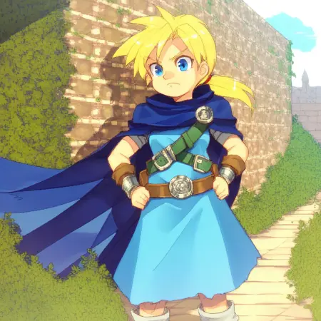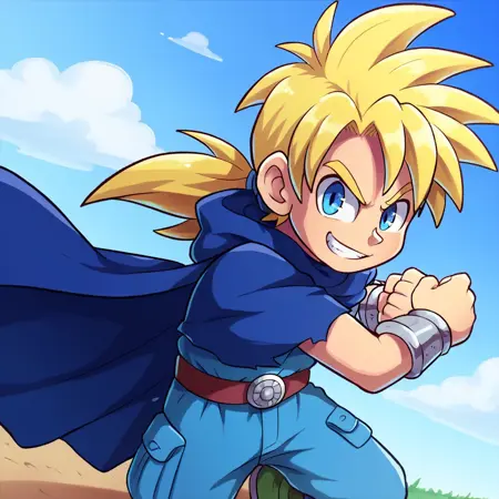 1boy, hs, blonde hair, spiked hair, ponytail, blue eyes, cape, belt