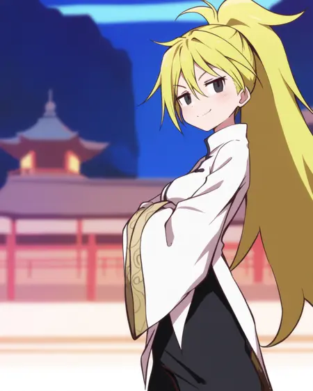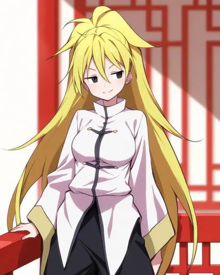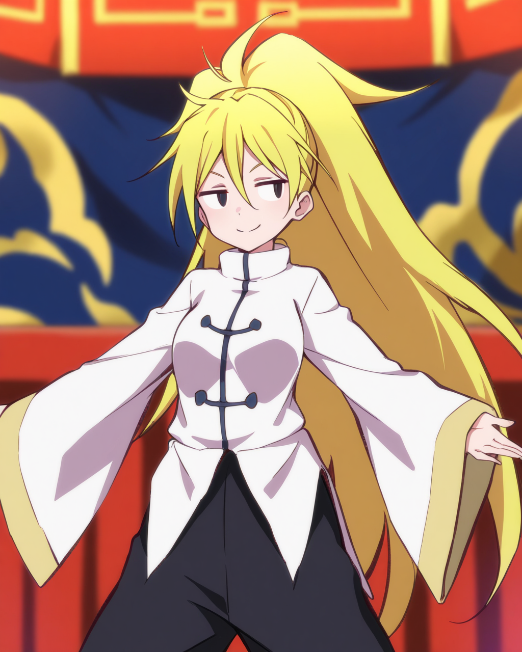 ,rin, 1 girl, ソロ, 黒目, 金髪, 長い髪, ポニーテール, 目の間の髪, 中国風の衣装, パンツ, 幅広い袖,