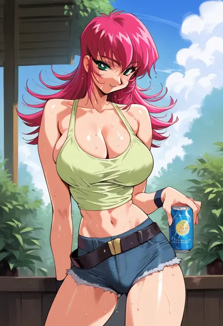 트리거: raikag, 분홍색 머리, 긴 머리, 녹색 눈, 가슴 사이, 재킷, 배꼽, 분리된 칼라