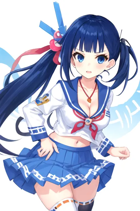 Tamsoft, 1girl, solo, very long hair, blue eyes, white shirt, pleated skirt, hair ornament, white thighhighs, cleavage, medium breasts, blue hair, side ponytail, blue skirt, seifuku, navel, long sleeves