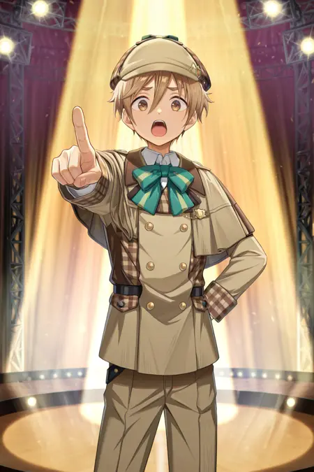 - 탐정, 갈색 카펠레, 갈색 재킷, 초록색 리본 넥타이, 갈색 바지, 디어스탈커 모자