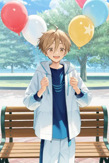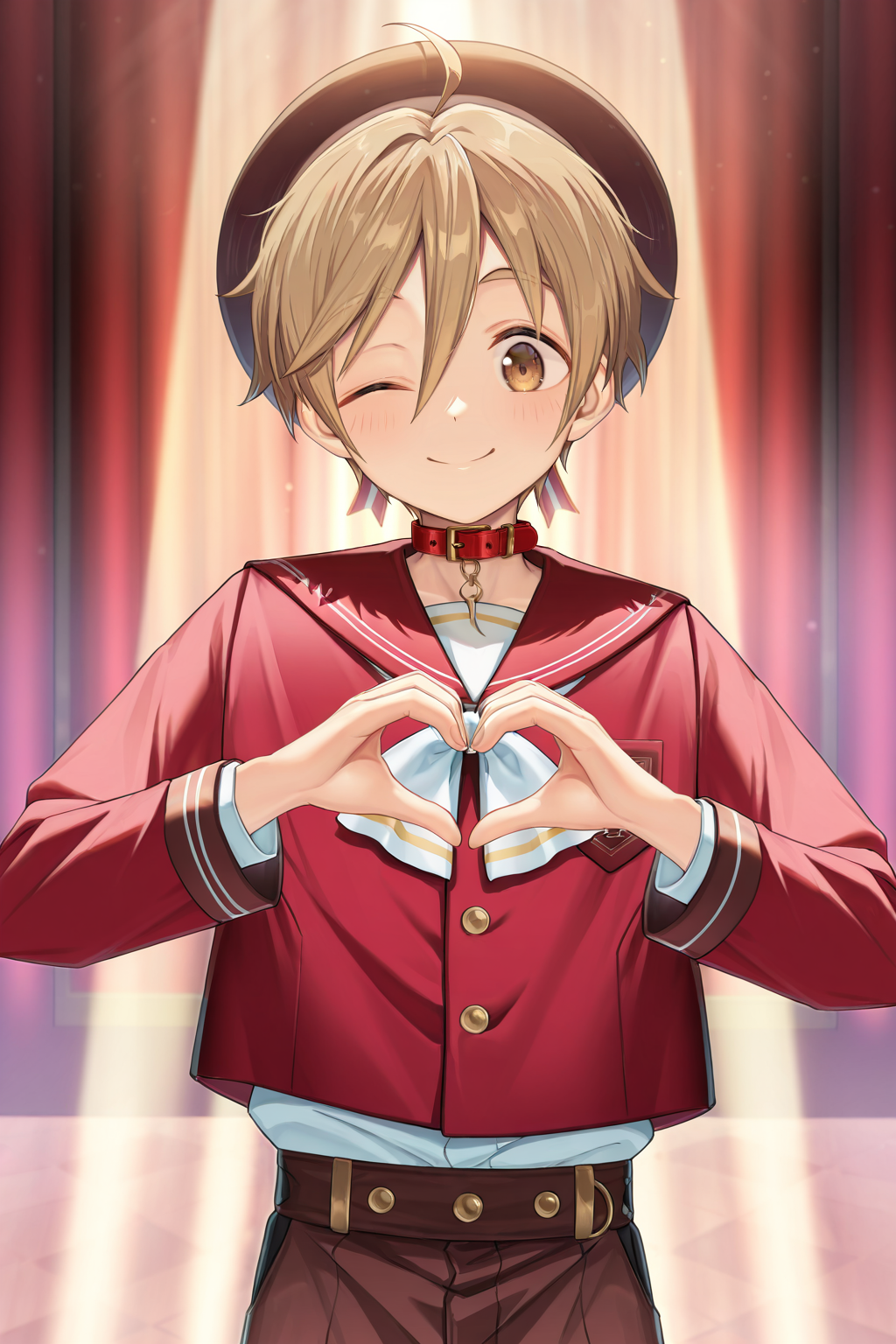 - 빨간 재킷, 빨간 선원 칼라, 흰색 셔츠, 갈색 모자, 갈색 반바지, 빨간 칼라