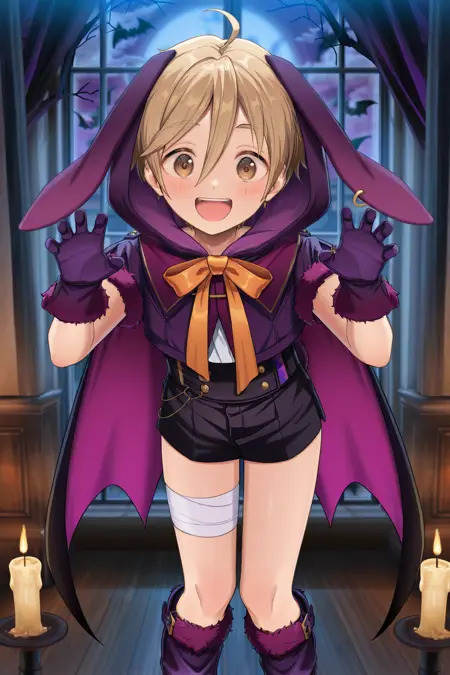 - 할로윈 복장, 보라색 토끼 귀, 귀를 아래로, 보라색 크롭 재킷, 모직 장식, 주황색 리본, 붕대, 보라색 부츠, 검은 반바지, 보라색 장갑