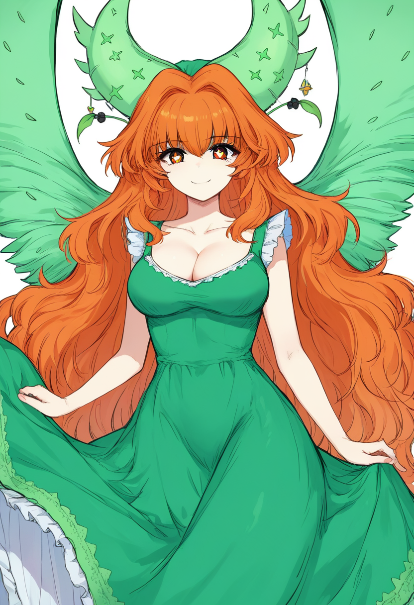 margaretbs2, 1girl, solo, breasts, long hair, orange hair, smile, +_+, symbol-shaped pupils,reiuji utsuho, bangs, wings, orange eyes, collarbone,