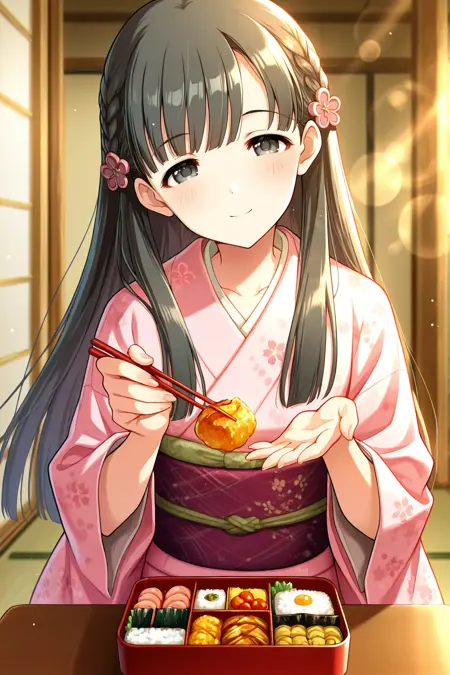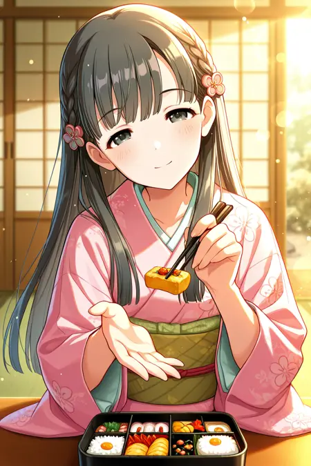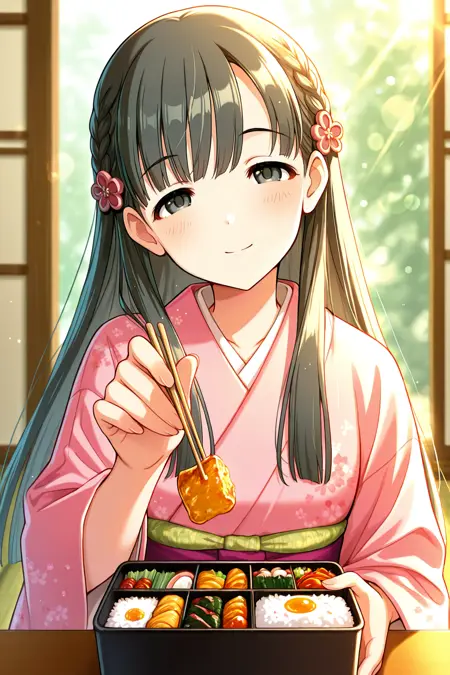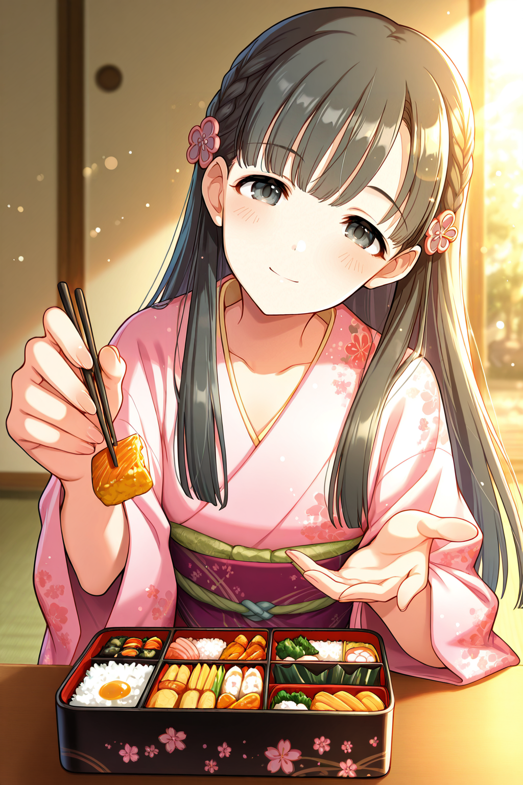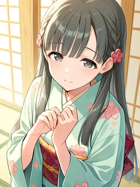 kbykwse kimono, kobayakawa sae, black eyes, black hair, braid, eyebrows visible through hair,