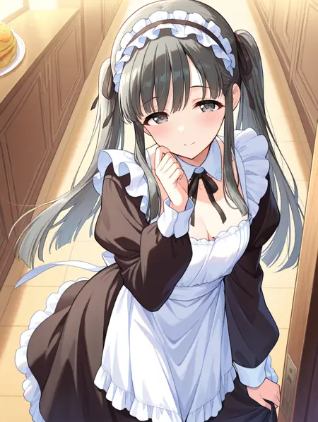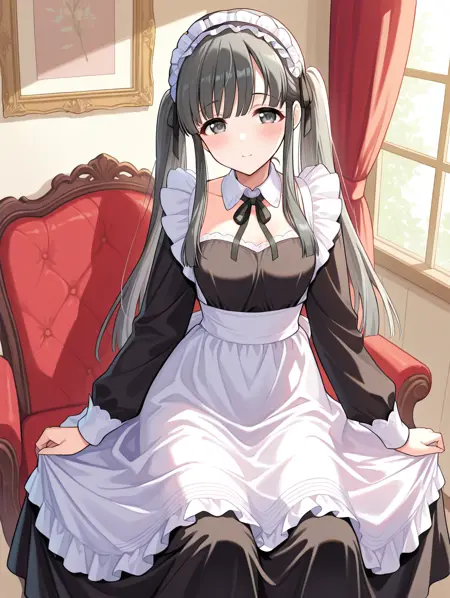 long sleeves, maid, neck ribbon, ribbon, sidelocks, twintails, white apron,