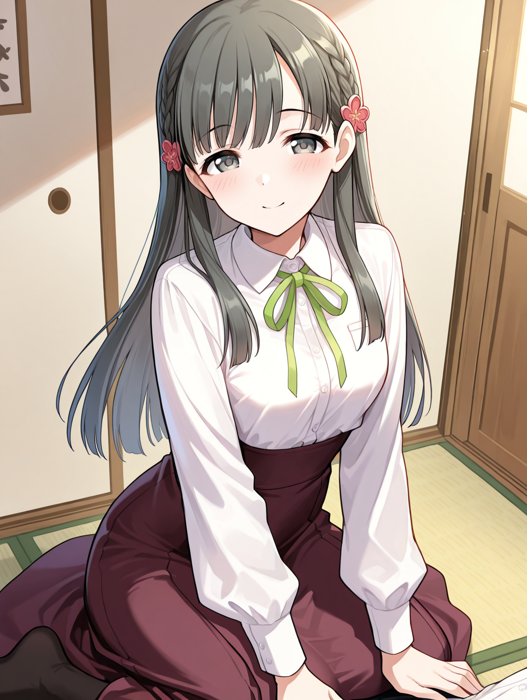 flower, grey eyes, black hair, hair flower, hair ornament, long hair,
