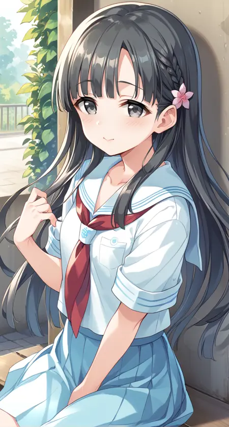 flower, grey eyes, black hair, hair flower, hair ornament, long hair,