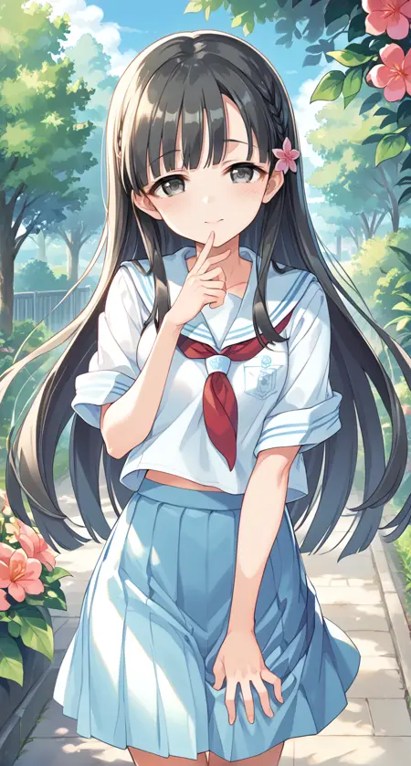 kbykwse school,kobayakawa sae,bangs,blue skirt,blunt bangs,collarbone,flower,