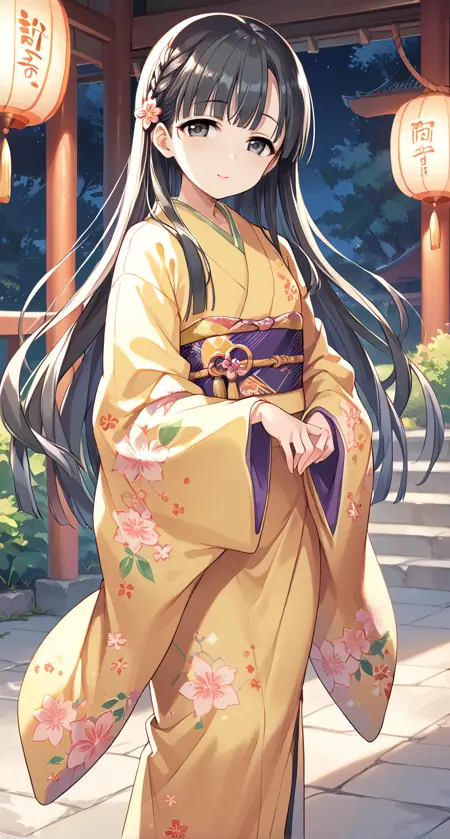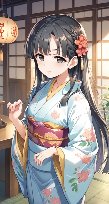 kbykwse kimono, kobayakawa sae, black eyes, black hair, braid, eyebrows visible through hair,