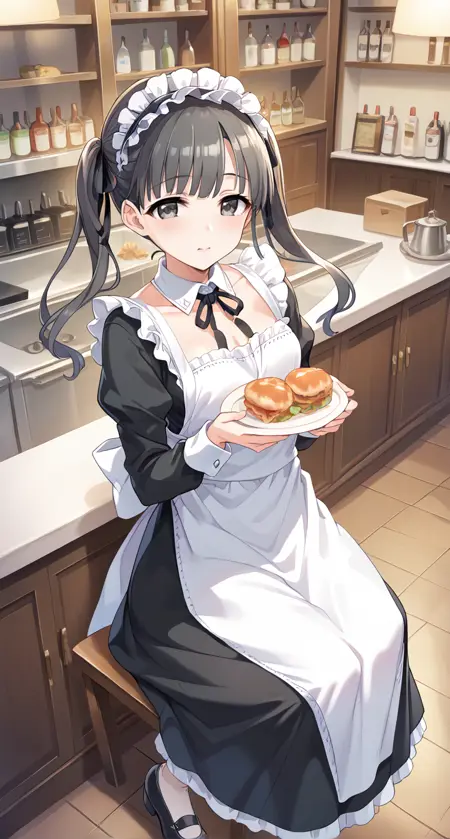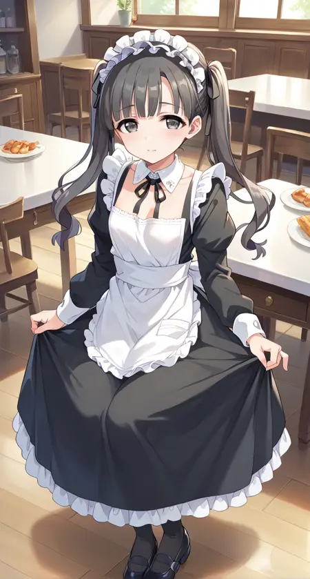 long sleeves, maid, neck ribbon, ribbon, sidelocks, twintails, white apron,