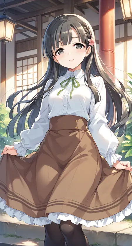 kbykwse aikurushii, kobayakawa sae, bangs, dress, brown skirt,long skirt, high-waist skirt, white shirt,