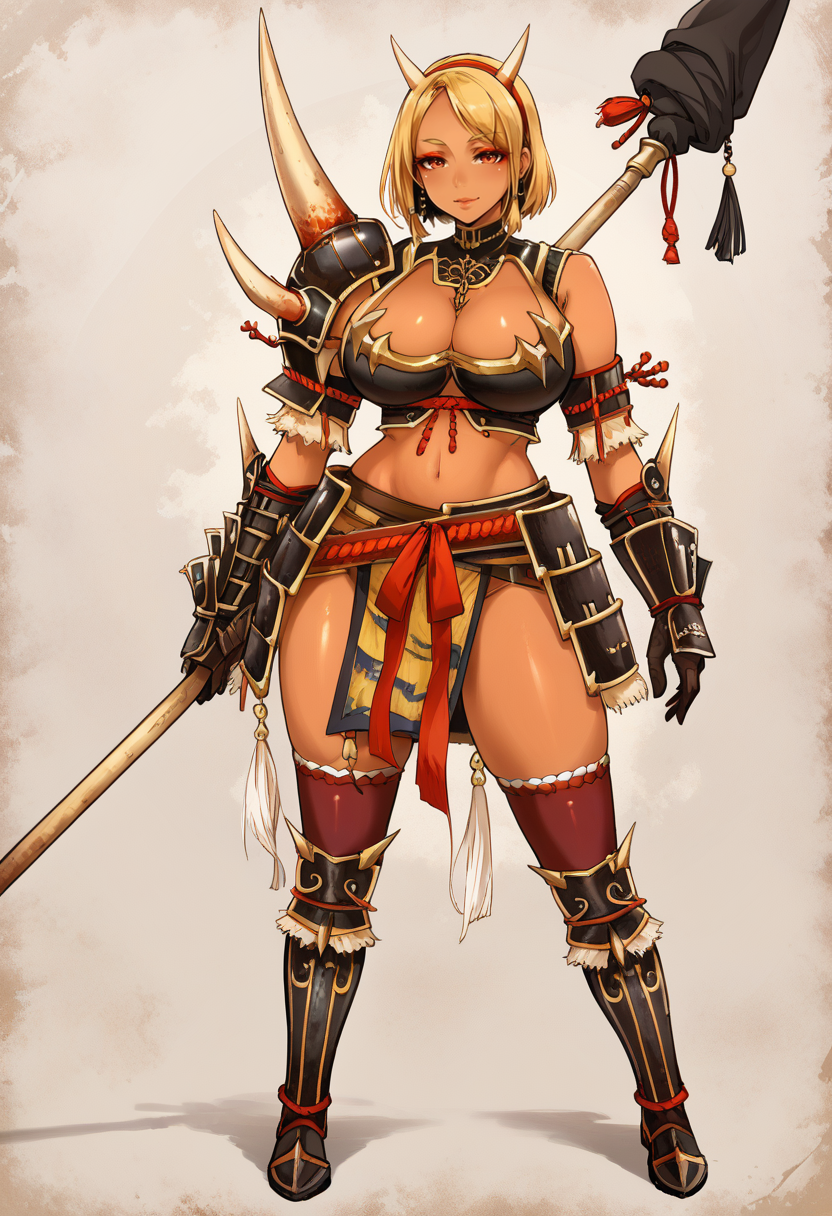 タグ(衣装):キシンアーマー、鬼角ヘアバンド、黒手袋、黒膝ブーツ、黒腰布、黒片肩パッド、黒ビキニアーマー