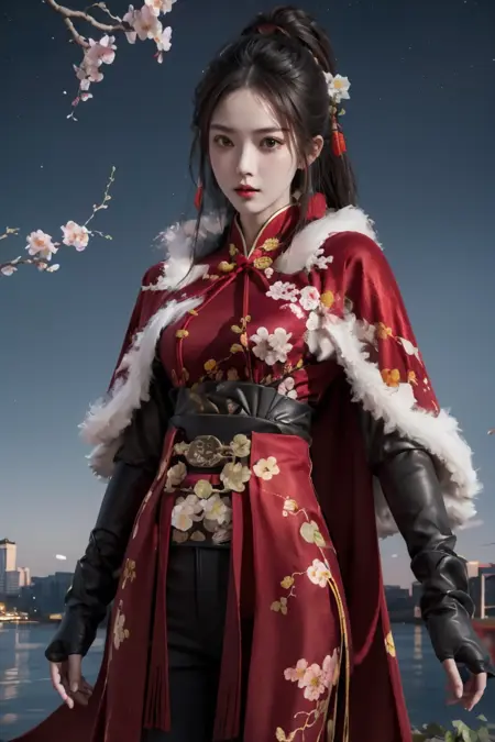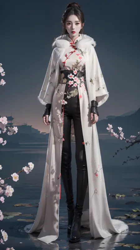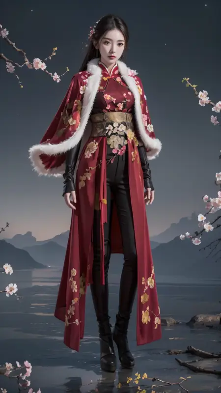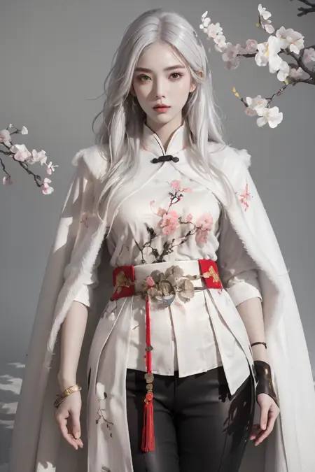 白色/红色功夫服,毛皮斗篷,花朵,桃枝,黑色裤子,长发,配饰