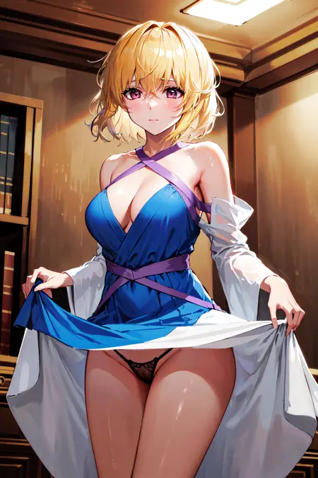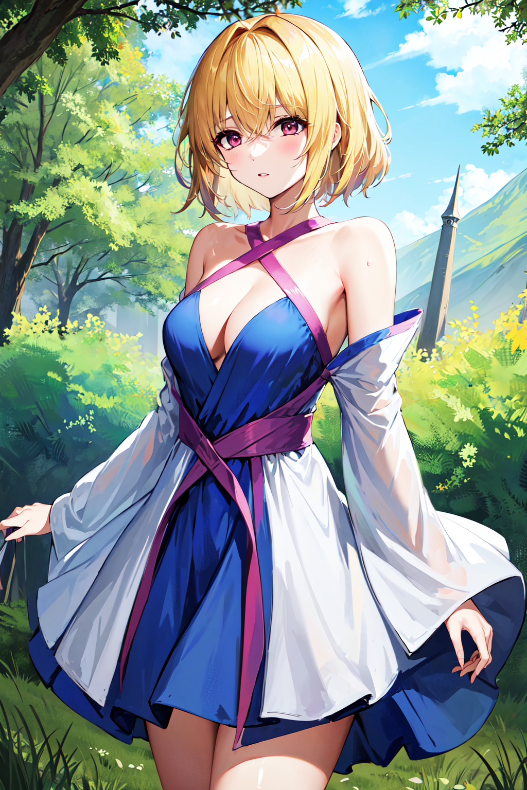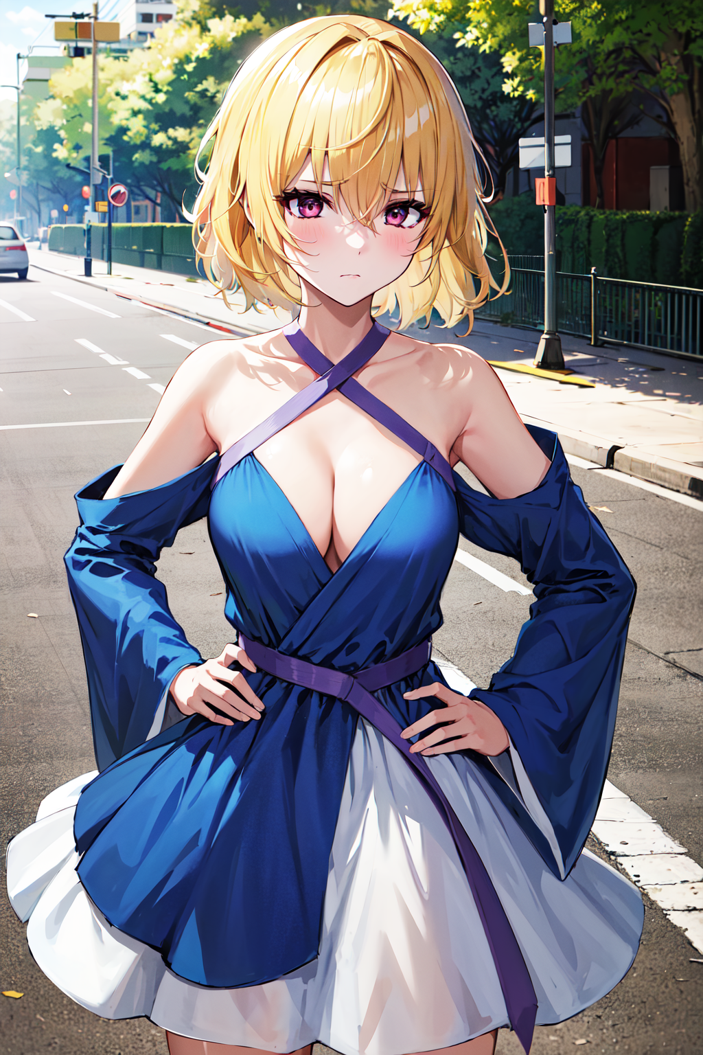 outfit2(ドレス)sl1, 1girl, short hair, messy hair, dress, detached sleeves, bare shoulders, cleavage, medium breasts