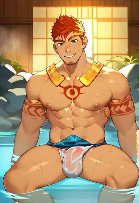 Tags: Kong_Gyee_H, solo, looking at viewer, smile, short hair, 1boy, navel, underwear, nipples, male focus, thighs, red hair, dark skin, stomach, orange hair, tattoo, muscular, facial hair, thick thighs, abs, dark-skinned male, pectorals, muscular male, staff, revealing clothes, bara, large pectorals, bulge, topless male, sideburns, mature male, goatee, bare pectorals, long sideburns, briefs,..
