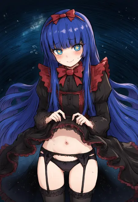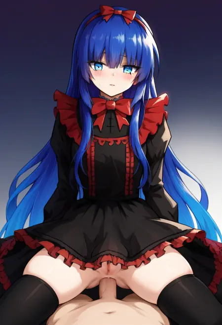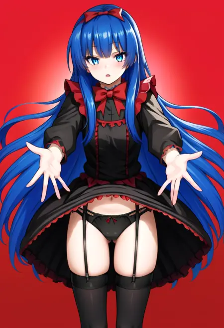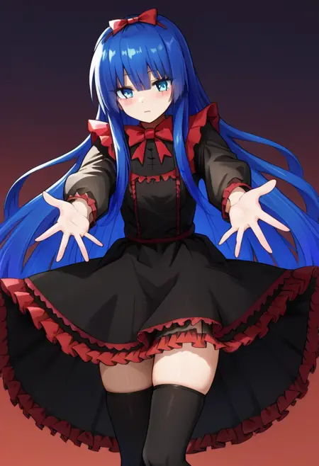 mabelbs2, 1girl, solo, long hair, blue eyes, blue hair thighhighs, bangs, very long hair,