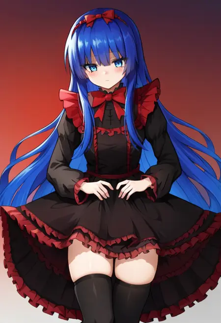 bowtie, red bowtie, hairband, thighs, thighhighs, frilled dress, frills, dress, bow, black dress,red bow, long sleeves, hair bow,