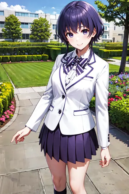 オシャレ1(セーラー服)栄道みちる、セルフ、プリーツスカート、ネクタイ、ストライプのリボン、白いジャケット、黒いソックス、紫のスカート、白いブレザー、ストライプのネクタイ、長袖